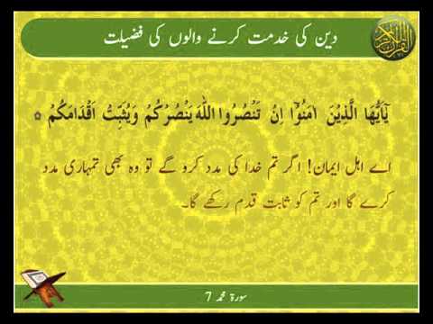 If ye help allah, he will help you and will make your foothold firm. Pada ayat 1, 2, dan 3 surat ini. يَا أَيُّهَا الَّذِينَ آمَنُوا إِنْ تَنْصُرُوا اللَّهَ يَنْصُرْكُمْ وَيُثَبِّتْ أَقْدَامَكُمْ. If you participate in the work of raising allah's word with your life and wealth. اگر تم خدا کی مدد کرو گے تو وہ بھی تمہاری مدد کرے گا اور تم کو ثابت قدم رکھے گا ﴿۷﴾.
